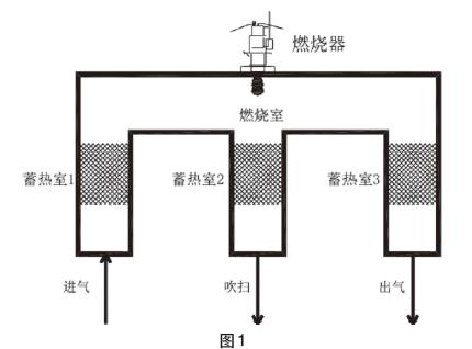 進廢氣前需開啟主風機,進新風對爐膛吹掃,廢氣聚集為高濃度廢氣。隨后開啟燃燒器預熱,預熱應緩慢進行,一般預熱時間為6小時左右,緩慢升溫至800℃,這個溫度可以分解95%以上VOCs氣體。開始進氣,如圖1先從蓄熱室1進去,經(jīng)蓄熱體預熱且擾流后,進入燃燒室。此時廢氣在燃燒室內(nèi)處于無規(guī)則流動,經(jīng)過充分燃燒(這個停留時間一般要求為1s以上),流向蓄熱室3。蓄熱室3內(nèi)的蓄熱體處于較低的溫度,充分吸收流出的廢氣的熱量,而高溫廢氣經(jīng)過蓄熱體熱量回收后,溫度變低可以排出。