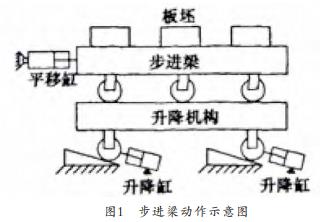 500機組加熱爐目前采用的是推鋼式出鋼,此種方式容易產生黑印、 粘鋼等弊端, 嚴重影響鋼材軋制的質量, 應改為目前為常用的步進梁出鋼方式。 步進梁式系統具有技術成熟、 出鋼高效等點, 其動作方式如圖1所示: