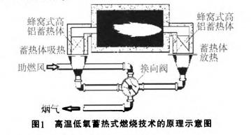 通過蓄熱式燃燒原理可知.常溫空氣是用高壓風(fēng)機(jī)由四通換向閥切換進(jìn)入預(yù)熱器后在短時(shí)間內(nèi)被加熱到700℃左右,熱空氣進(jìn)入爐膛后,抽吸周圍低氧爐氣,從而形成含氧量低于21%(一般在15%)的低氧高溫空氣。然后再與空氣噴嘴附近噴入的燃料混合燃燒。